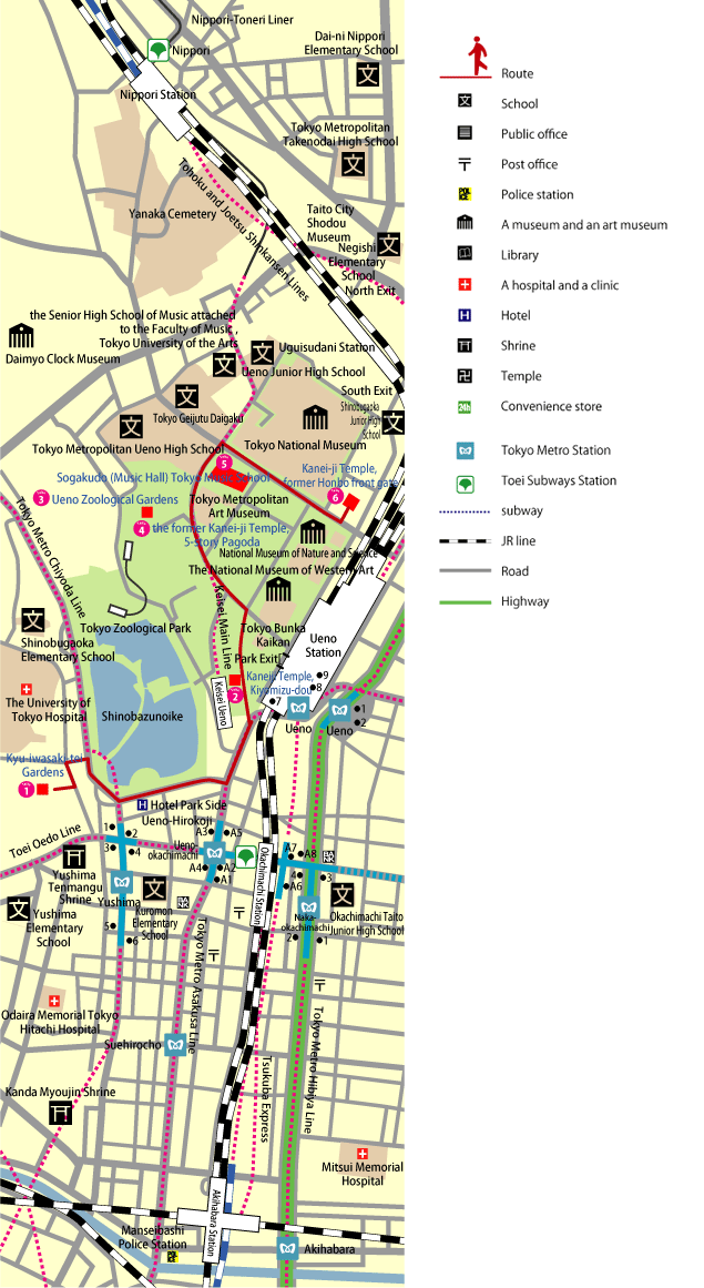 - 5-10 minites' walk from JR Ueno Station, Subway Ueno Stations (Ginza-line or Hibiya-line), Keisei Ueno Station, or Subway Nezu Station (Chiyoda-line)