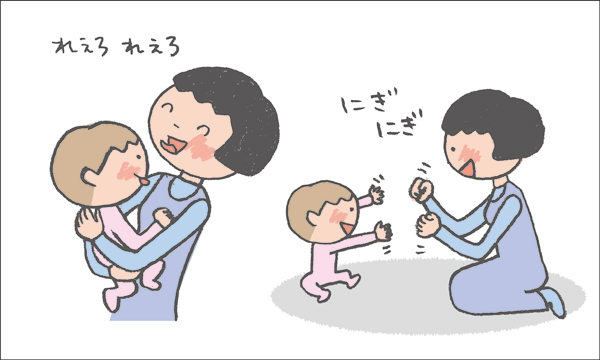 - ・イラストでは、お母さんが両手で「にぎにぎ」をしていますが、両手の動きを見ることは赤ちゃんには難しい事なので、最初は片手でやるとよいです。